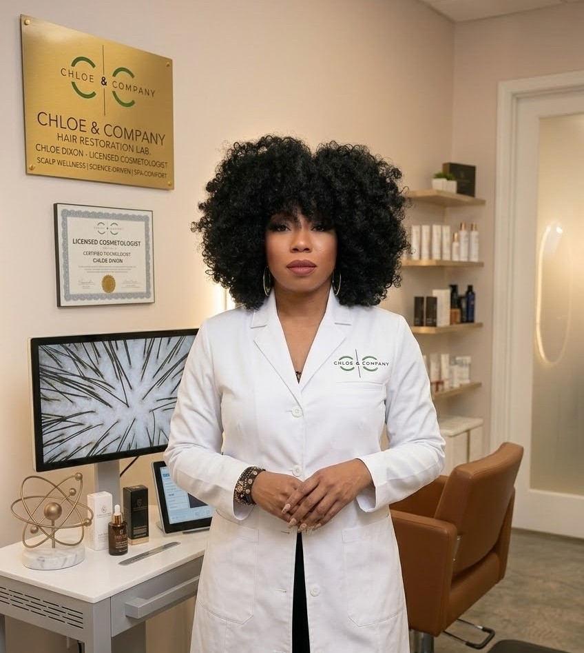 At Chloe & Co, artistry meets advanced scalp science. What began as a trusted destination for precision cuts, styling, relaxers, and color has grown into a results-driven studio offering scalp imaging, microchanneling, hair-loss prevention programs, and natural-looking non-surgical hair replacement.